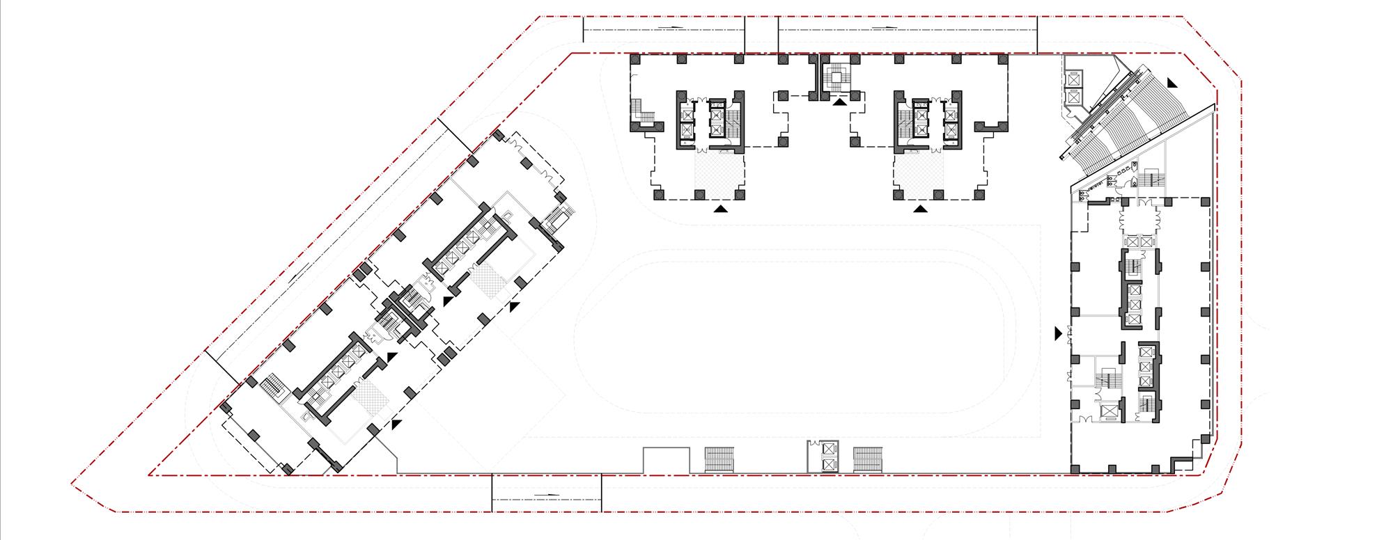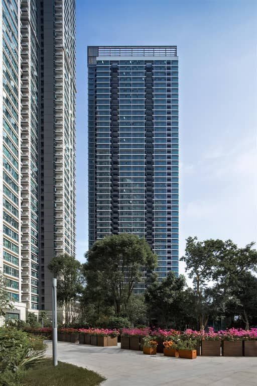 规考虑到用地狭小,深圳金领假日公寓顺应早期皇御苑社区规划肌理,在规划布局上打破长板布局,优先与南侧住区最大限度拉开间距,给城区提供喘息空间,保障区域阳光和通风,同时贴近北侧中心公园色,令住区以山脊之势同享南北两侧景色。3 栋塔楼建筑组群围绕南侧庭院呈半围合式布局,尽全力保留公庭院的完整和无干扰,形成合理楼距,将街角退让给城市,整体创造丰富的城市界面。